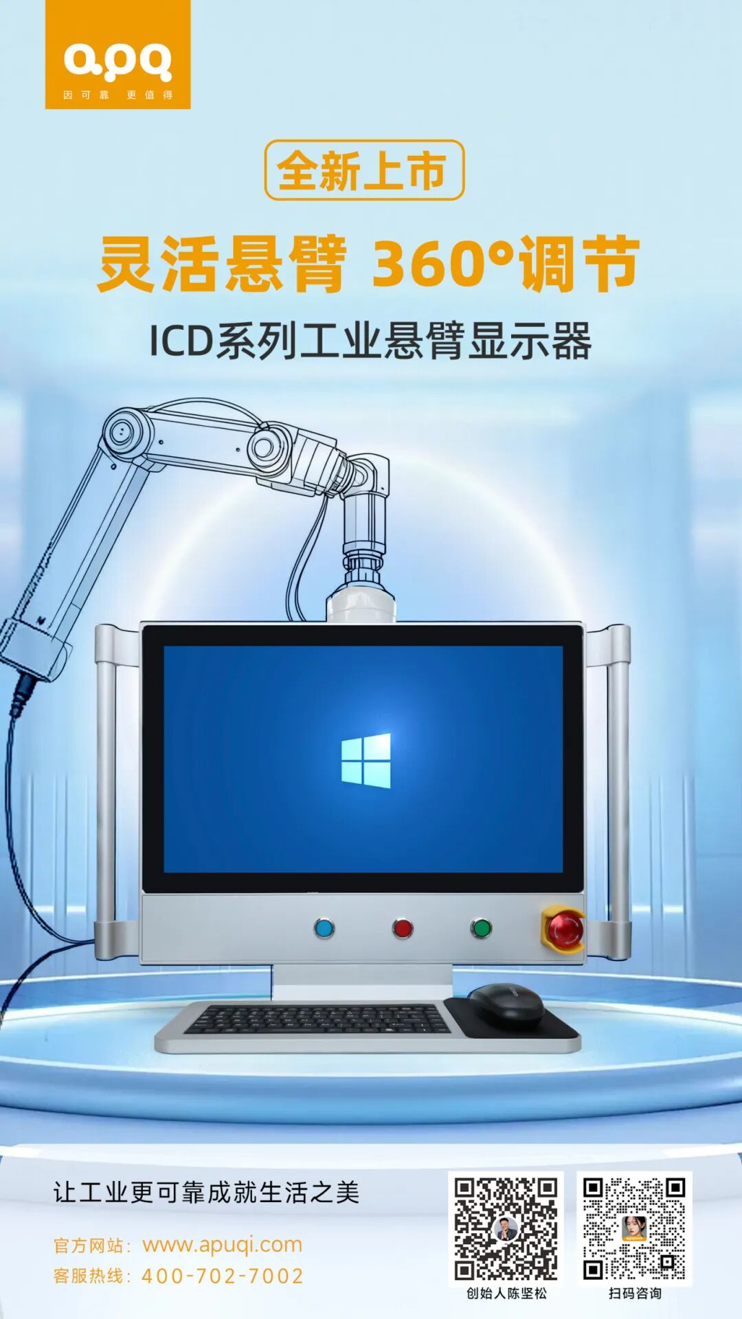 在工业自动化、智能控制与可视化交互日益重要的今天,一款可靠、清晰且适应严苛环境的工业显示器,已成为生产线、控制中心、设备监控等场景中不可或缺的伙伴。阿普奇全新推出的ICD系列工业悬臂显示器,集电容触摸、多接口兼容、坚固防护于一体,凭借其出色的防护性、清晰的显示效果与灵活的安装方式,为工业显示领域带来全新选择。
