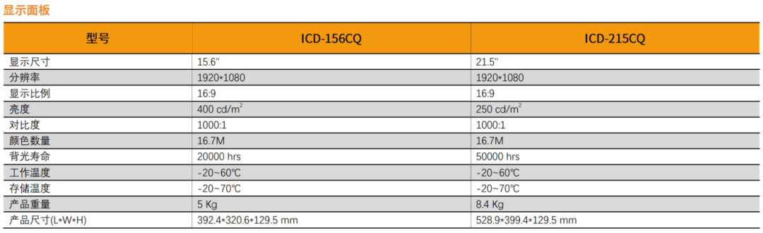 全高清分辨率:两款型号(ICD-156CQ/ICD-215CQ)均标配1920*1080全高清分辨率,16:9显示比例,画面细腻。